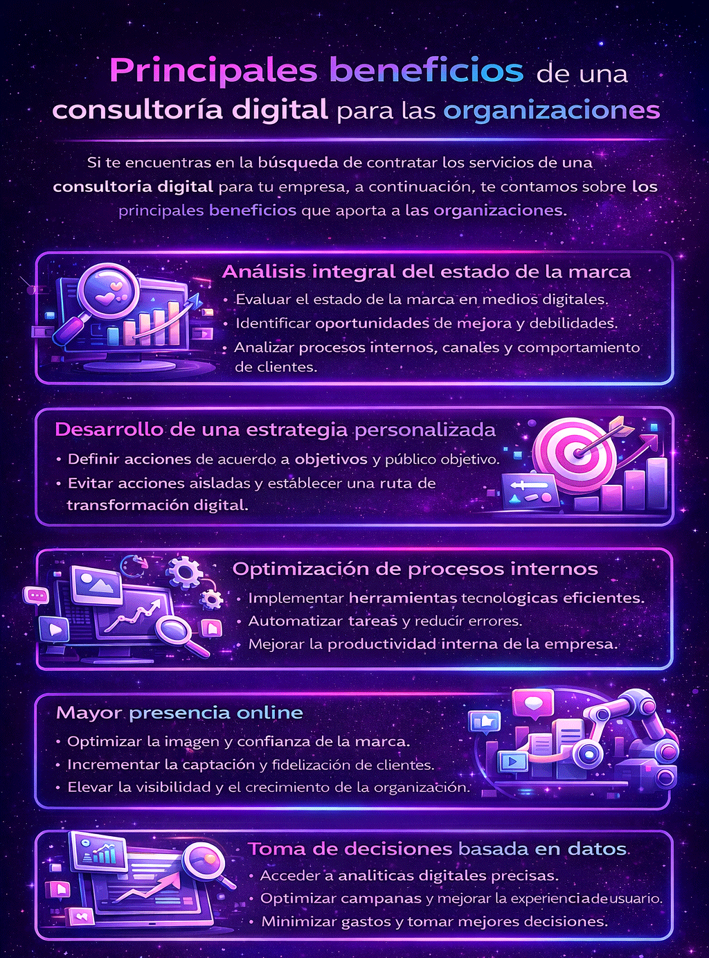 Toda consultoría digital facilita la adaptación de las empresas ante los constantes cambios tecnológicos y nuevos hábitos de compra. Esto, por medio de una transformación digital eficiente. En la consultoría se encargan de guiar todo el proceso, al implementar diversas herramientas tecnológicas y liderando el equipo de trabajo hacia los objetivos establecidos. A la vez, se encargan de mantener a la empresa al tanto de las tendencias y nuevas formas de marketing, incrementando la competitividad de la marca y relevancia ante la competencia.